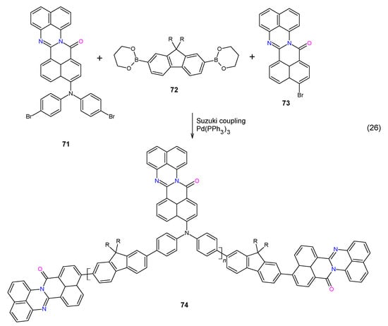 11-Bromo-14H-benzo[4,5]isoquino[2,1-a] perimidin-14-one (73) was obtained by reaction 3, where 4-bromo-1,8-naphthalic anhydride was condensed with 18, which was then coupled with diphenylamine and further brominated to give 11-Bis (4-bromo-phenyl) amino-14H-benzo[4,5]isoquino[2,1-a]perimidin-14-one (71). The resulting polymer 74 was black and well dissolved in typical organic solvents, which allowed full characterization using FTIR and NMR spectroscopy. Molecular weight measurements were also made to give Mn = 9300 g/mol and Mw = 18,200 g/mol, resulting in a polydispersity factor of 1.95. In the reaction 26, the same authors obtained a similar polymer replacing diphenylamine with carbazole [108].