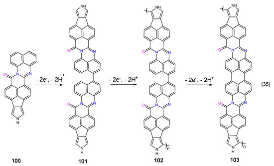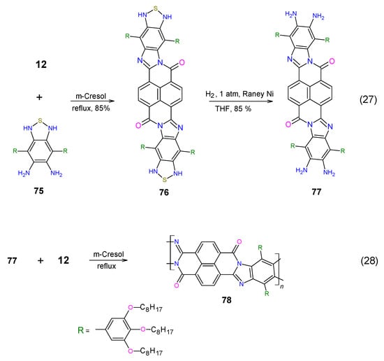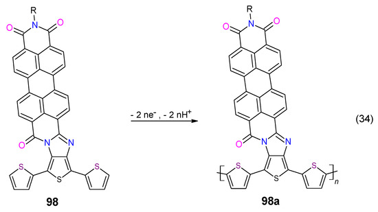 In addition to ladder polymers, conjugated polymers were also obtained in which the main skeleton was made of electron donor repeat units, while the electron acceptor derivatives of perinone were incorporated as side groups [107]. Typical synthesis is shown in Figure 23.
