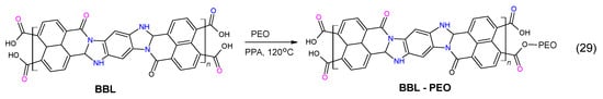 Hirvonen et al. [120,121] prepared amphiphilic BBLs with poly(ethylene oxide) attached to the chain ends. The reaction is presented in Figure 26.