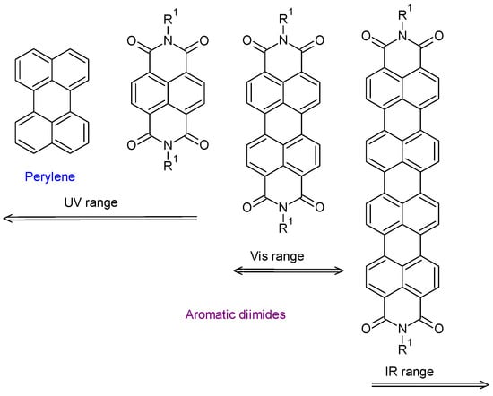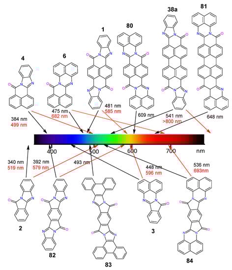 It is well known that an increase in the size of the π-conjugation causes a shift toward a longer absorption wavelength (bathochromic shift) [127,128]. The selection of appropriate aromatic carboxylates and diamines allows the conjugation length of the obtained perinone derivatives to be to easily controlled. It should be added, however, that in the case of solid state materials, the color largely depends on the structure of the perinone derivatives because the molecular structure controls the intermolecular interaction in the solid state and determines the crystal packing. In Figure 28, examples of perinone derivatives with different conjugation length and their maxima of absorption in solution (marked with black arrow) and maxima of luminescence peaks (marked with red arrow) are listed.