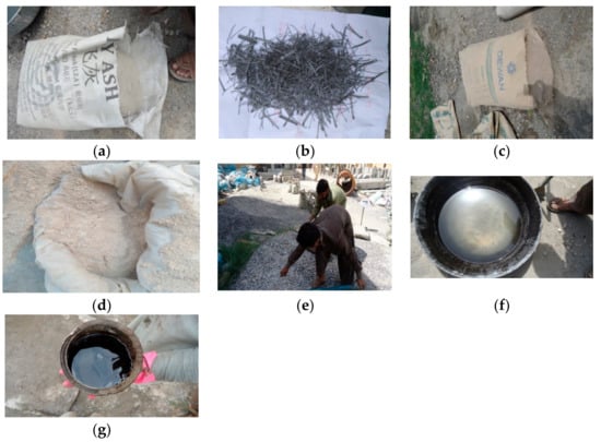 The materials used in the present study to produce QRD incorporated FA and SG-based GPC (QFS-GPC) reinforced with steel fibers; (a) fly ash, (b) ground granulated blast furnace slag, (c) steel fibers, (d) quarry rock dust at site, (e) aggregates, (f) alkaline solution, and (g) superplasticizer.