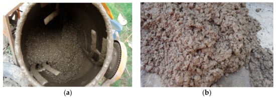 (a) The mixing of ingredients in a mechanical mixer. (b) The freshly prepared SF-reinforced GPC mixture.
