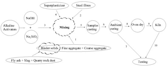 The mix production to the testing sequence of GPC specimens. 1—mixing of Raw materials; 2—adding Steel fibers; 3—Adding alkaline solution; 4—Adding superplasticizer; 5—Casting of samples; 6—Curing of samples at room temperature; 7—Compressive, tensile and flexural testing of samples; 8—Oven dry of samples; 9—Heating of samples at elevated temperature; 10—Mechanical tests.