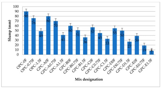 The rheology of a GPC mix is generally not similar to that of an OPC mix. Hence, the slump values of GPC do not resemble the same level of workability in OPC mixtures []. Based on compaction, slump values of GPC are classified as: highly workable (90 mm and above), medium workable (50–89 mm), and low workable (less than 50 mm) []. According to this criterion, GPC mixtures with 0% and 0.75% SF contents are medium workable except GPC-E0F; and those with 1.5% SF content are classified as low workable.