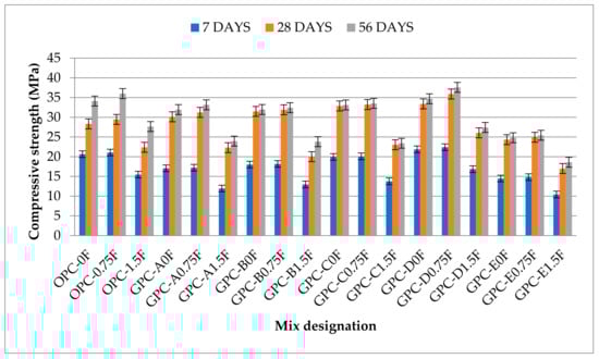 Compressive strength is an important property of concrete that is connected to other mechanical properties as well. According to ACI 318 M-11 [], the 28 day compressive strength needs to be at least 28 MPa for basic engineering applications, while it should be 35 MPa for corrosion protection of deform steel bars in concrete. In this study, all samples were tested at the age of 7, 28, and 56 days according to ASTM C39/C39M [], as shown in Figure 5. The mean values of the compressive strength test results of OPC and GPC mixes obtained from three identical samples are shown in Figure 6. Generally, FA- and SG-based GPC mixes exhibit higher compressive strength values than the OPC-based mixes []. It can be observed from Figure 6 that the compressive strength of GPC mixes GPC-B0F, GPC-C0F, and GPC-D0F, increased by increasing the QRD replacement level up to 15% (i.e., for 5%, 10%, and 15% QRD replacement).
