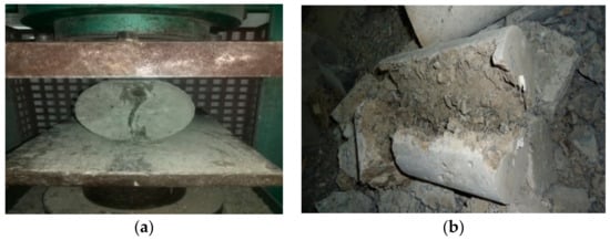 (a) The splitting tensile load application on a cylindrical specimen; and (b) the failure of the specimen after the test.
