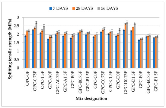 The splitting tensile strength of OPC-0F (1.91 MPa) and GPC-D0F (1.94 MPa) at the age of 7 days were maximum among OPC and GPC specimens, respectively. The splitting tensile strength of QFS-GPC specimens without fibers viz. GPC-B0F, GPC-C0F, and GPC-D0F are 3%, 5%, and 6% higher, respectively, than the GPC control mix GPC-A0F (without QRD). However, GPC-E0F shows a decrease in splitting tensile strength than GPC-A0F. This decrease in strength can be attributed to the decreased workability of the mix due to increased QRD content, thus making it more difficult to handle during placement. The additional water or admixture (superplasticizer) was added to the mix (GPC-E0F) to increase the workability, ultimately decreasing the splitting tensile strength.