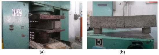 (a) Flexural testing setup for Prismatic specimens of length 500 mm; and (b) the failure of a specimen after the test.