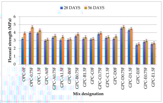 The flexural strength test is carried out to find the indirect tensile strength of concrete, also known as the modulus of rupture (MOR). It is an important property that affects concrete’s shear strength, bending characteristics, and brittleness ratio in structural concrete design. In this study, the flexural strength was determined by using prismatic specimens (100 × 100 × 500 mm) at the age of 28 and 56 days according to ASTM C1609 [], the standard test method used for the flexural performance of fiber-reinforced concrete. The flexural strength testing of prismatic samples under center point loading is shown in Figure 9. It can be noticed from Figure 10 that flexural strength of QFS-GPC mixes viz GPC-B0F, GPC-C0F, and GPC-D0F, are 3%, 7%, and 10% higher, respectively, than GPC-A0F (without QRD). This higher strength indicates that the flexural strength of QRD-blended specimens increased with the increase in QRD content up to 15%. The maximum flexural strength of non-fiber specimens at the age of 28 days was obtained by the mix GPC-D0F (3.65 MPa) with 15% QRD content. However, the flexural strength of GPC-E0F (with 20% QRD content) decreased by 18% from GPC-A0F (without QRD). The test results also showed that flexural strength of GPC mixes without fibers, i.e., GPC-A0F, GPC-B0F, GPC-C0F, and GPC-E0F were 8%, 5%, 2%, and 25% lower than the OPC control mix, i.e., OPC-0F. However, the flexural strength of GPC-D0F was 2% higher than the mix OPC-0F. Hence, GPC-D0F can be considered as an optimum mix considering the flexural strength. The test results also showed that the flexural strength of all GPC mixes increased with age. However, this rate of strength gain is slower than the OPC mix samples.