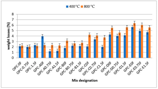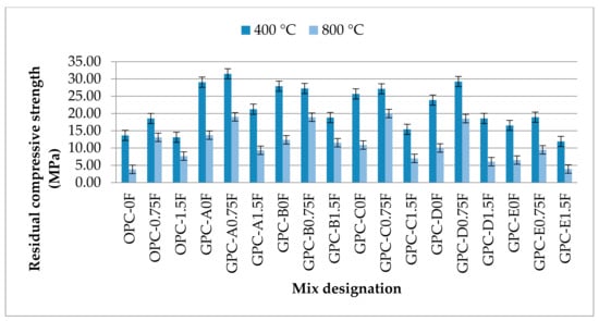 The specimens from each mix group were subjected to elevated temperatures (400 °C and 800 °C) at the age of 56 days to measure the weight loss and residual compressive strength. The oven-dried samples were placed in an electric furnace of 1000 °C heating capacity. The specimens were exposed to an elevated temperature at 8 °C/min heating rate until the target temperature was reached. The specimens were kept for 1 h at the required temperature, i.e., 400 °C and 800 °C. After heating, the specimens were cooled at room temperature. The weight before and after the exposure was measured to determine the weight loss of specimens. The results for weight loss of specimen mixes are presented in Figure 11. The replacement of SG with QRD resulted in an increase in the weight loss of QRD-blended mixes. The weight loss observed in GPC mixes viz. GPC-A0F, GPC-B0F, GPC-C0F, GPC-D0F, and GPC-E0F at 800 °C were 2.34%, 3.13%, 4.23%, 5.5%, and 6.35%, respectively. The weight loss values were increased with the increase in QRD content. The increase in weight loss may be due to the higher loss on ignition (LOI) of QRD (38.65%) compared with the FA (2.9%) and SG (3.4%). The weight loss values of QRD-blended GPC mixes are higher at 800 °C than 400 °C since the release of gases in the form of carbon dioxide (CO2), due to thermal decomposition of concrete, occurred at 800 °C. The addition of 0.75% steel fibers in all GPC mixes, i.e., GPC-A0.75F, GPC-B0.75F, GPC-C0.75F, GPC-D0.75F, and GPC-E0.75F, resulted in a reduction in weight loss by an amount of 2.32%, 2.67%, 4.11%, 4.63%, and 6.04%, respectively, compared with their counterparts without fibers. This reduction in weight loss by fibers can be due to the high heat-absorbing capacity of SF. The lowest weight loss was observed in the OPC mix OPC-0.75F and the GPC mix GPC-A0.75F. The reduced weight loss in these specimens can be due to lesser calcium content and SF presence that resisted the decomposition process.
