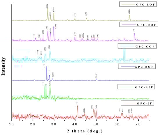 Figure 13 shows the XRD pattern (2θ = 10–75°) of OPC and GPC mixes (without steel fibers) observed after 28 days of ambient curing. The most significant zone where the reactions occur in the mix is in the range of 2θ = 20–30°. For the specimen GPC-D0F, sharp diffraction peaks are more in this range than all the other samples, including the control mix; which shows that GPC-D0F is highly crystalline. Similarly, in the temperature range 2θ = 40–50°, OPC and GPC-D0F show peaks representing crystalline phases while the other samples, viz. GPC-A0F, GPC-B0F, GPC-C0F, and GPC-E0F are in amorphous phases. Limited periodicity of atoms in the range of 2θ = 60–70° was also present in the samples GPC-C0F, GPC-D0F, and GPC-E0F due to the presence of QRD. The unreacted fly ash and QRD contains crystalline phases such as quartz (SiO2), mullite (Al6Si2O13), and maghemite and hematite (Fe2O3). Some studies on geopolymer materials indicate that a small amount of quartz may have a positive effect on the mechanical properties, and other minerals may have a detrimental effect on the geopolymer []. Hence, it can be observed from XRD diffractogram that an increase in the QRD content up to 15% in all GPC mixes resulted in an increase in the compressive strength due to the formation of crystalline phases. This increase is because mechanical properties (compressive, tensile, and flexural) of concrete mixtures increase in the presence of a high amount of calcium-rich species at ambient curing temperature [,].