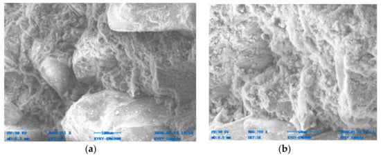 SEM image of GPC-D0F mix specimen; (a) magnification 321×; (b) magnification 738×.