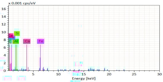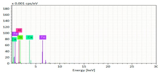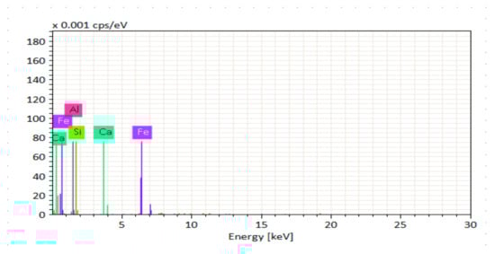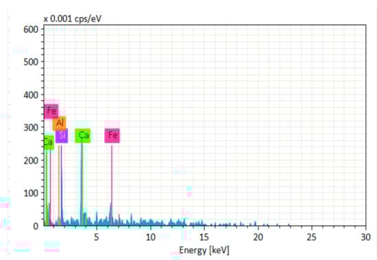 A universal testing machine (UTM) of 3000 KN capacity was used for compressive and splitting tensile strength tests of the specimens at various ages, i.e., 7, 28, and 56 days, according to ASTM C39/C39M-03 [] and C496/C496M−11, respectively. The flexural strength test was performed on prismatic samples at the ages of 28 and 56 days under third point loading according to ASTM C1609/C1609M-19a []. The workability of mixes was measured by using a slump cone test conforming to ASTM C143M-15a []. After 56 days of curing, three samples (150 mm cubes) from each mix group were subjected to elevated temperatures (400 °C and 800 °C) in an automatic controlled electric furnace of 1000 °C capacity following ASTM E 119 []. The samples were then cooled at room temperature, and residual properties, i.e., compressive strength and weight loss, were determined. The microstructural characterization of the specimens was evaluated by X-ray diffraction (XRD) analysis, energy dispersive spectroscopy (EDS), and scanning electron microscopy (SEM). The XRD test was performed to provide fundamental information on the geopolymer crystal structure. A crystal structure is one of the important aspects of materials since many properties depend on it. The X-ray diffraction (XRD) test was performed using JEOL JDX-3532 (JEOL, Tokyo, Japan), with a step size of 0.025° and 2θ range from 10–75° to analyze the geopolymer structure to find whether it is crystalline or amorphous. The powder method was used to evaluate the degree of crystalline structure in the polymer. The sample was scanned with a voltage of 40 kV and a current of 30 mA using a copper X-ray tube (Cu-Kα radiation). It has been reported that diffraction occurs only if electromagnetic radiation interacts with periodic structures. The non-crystalline portion in GPC mixes simply scatters the X-ray beam to give a continuous background, whereas the crystalline portion causes diffraction lines (peaks) that are not continuous. Miller indices of the peaks describe the information about the planes of diffraction [,].