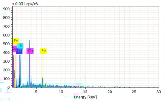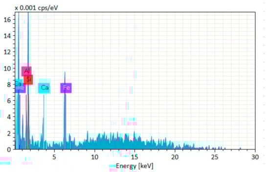 The EDS test was carried out to study the chemical composition of the GPC mixtures. The energy dispersive spectroscopy (EDS) test was performed for the area using JSM-5910 (Oxford Instruments, Abingdon, UK) to find the chemical composition of geopolymers. For the purpose of testing, a sample of GPC is taken out from the middle of the cube specimen cured for 28 days and then ground to a powder with the help of mortar and pestle. The powdered sample is then oven-dried to remove moisture. The EDS data is acquired using INCA software at five different spectrums (locations) on the SEM image. SEM was undertaken to study the fracture surface of the GPC specimens. The SEM analysis was carried out using JSM-6490 (JEOL, Tokyo, Japan) to study the microstructural behavior of GPC specimens when subjected to an elevated temperature of 800 °C. Samples were collected from the failed specimens in the compressive strength test from the adjacent parts of failure surfaces.