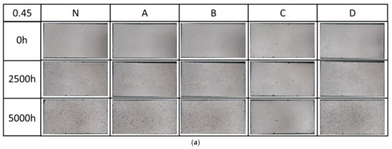 Regarding the differences among the surface coating materials, compared to the initial test (0 h data), the coating surface became rough on the silane1 A, silane2 B and silicate D surface specimens after 2500 h and 5000 h of weathering, indicating that the coating surface is deteriorated. The formation of roughing on the surface also has been reported in the literature on the surface of aged silicate and silane coatings, which is the effects of xenon-arc radiation weathering [37,38]. However, before and after 5000 h of weathering, C specimens, which were coated with fluor-resin coating, were intact.