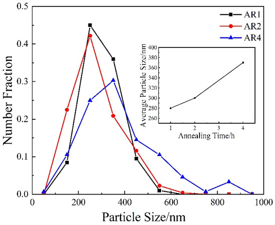 - The samples were annealed at 600 °C after warm rolling. As the holding time increased, the fraction of cementite particles in the grains decreased, and the size of cementite particles at the grain boundaries increased. The yield strength of the annealed samples was above 600 MPa, and the total elongation was above 16%, which had a good combination of strength and plasticity.