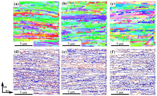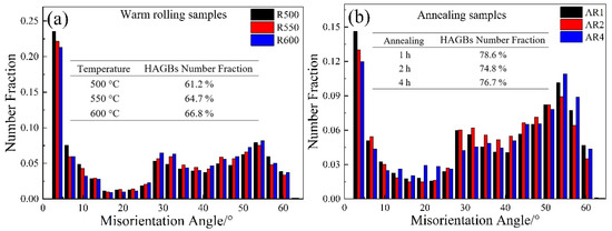 - After warm rolling at 500 °C, 550 °C, and 600 °C, the martensite of medium carbon martensite steel was decomposed. When warm-rolled at 500 °C, 550 °C, and 600 °C, the average ferrite grain size was 0.41 μm, 0.44 μm, and 0.53 μm, respectively, and the proportion of HAGBs was 61.2%, 64.7%, and 66.8%, respectively. The room temperature tensile strength of the warm-rolled samples was above 950 MPa, accompanied by the total elongation of about 10%, which is of great value for application to a certain extent.