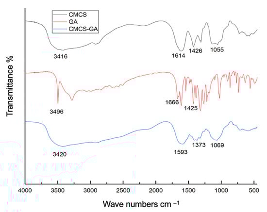 FTIR spectra of CMCS, GA, and CMCS-GA.