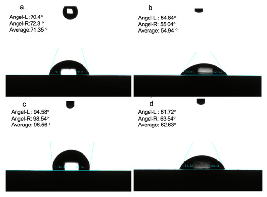 The static water contact angle was measured by the sessile drop method using a contact angle goniometer (JY-82B Kruss DSA, Kruss, Hamberg, Germany). Images of water spreading on the sample surfaces were recorded by a camera, and the contact angle was analyzed with professional software. Three measurements were made for each sample.