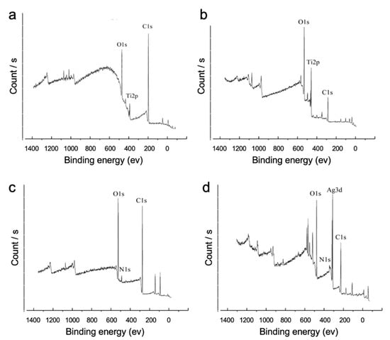 XPS spectra of (a) original titanium alloy (Ti), (b) Ti-OH, (c) Ti-gel, and (d) Ti-gel-AgNPs.