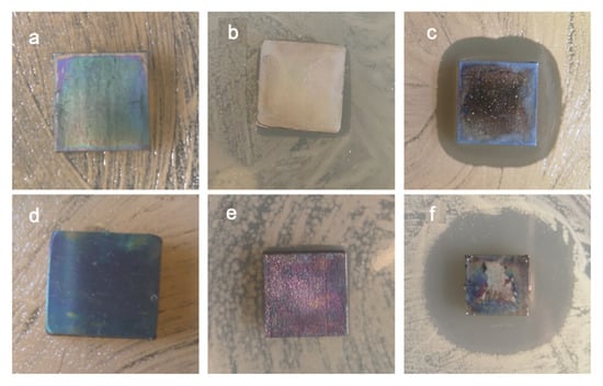 The zone of inhibition (ZOI) of E. coli. (a–c) and S. aureus. (d–f) after incubation with original titanium alloy (a,d), Ti-gel (b,e), and Ti-gel-AgNPs (c,f).