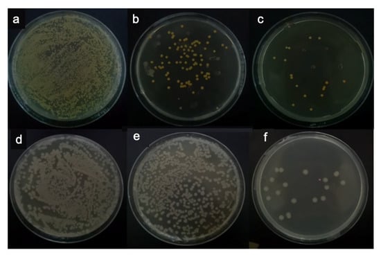 Colonies number of E. coli. (a–c) and S. aureus. (d–f) after incubation with CMCS-GA-gel and CMCS-GA-AgNPs. (a,d) are blank controls; (b,e) are the group incubated with CMCS-GA-gel. (d,f) are the group incubated with CMCS-GA-AgNPs.