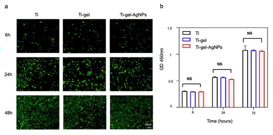 MSCs fluorescence imaging (a) and viability (b) after co-cultured with Ti, Ti-gel, Ti-gel-AgNPs for 6 h, 24 h, and 72 h. NS means no significant.