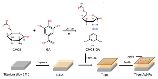 To date, various strategies have been reported to modify titanium surfaces with antibacterial properties, which mainly include: (1) loading of antibacterial drugs, such as antibiotics [3], or attaching antimicrobial peptides [4] to the surface; (2) introducing inorganic antibacterial metal elements such as F, Cu, Zn, or Ag by alloy or modification [5]; (3) applying a coating of antibacterial polymers [6]. Antibacterial drugs such as antibiotics are generally combined with the substrate through covalent bonding [7] or non-covalent adsorption [8,9,10]. However, these methods are not only prone to drug resistance, but also usually have a burst phase at the initial stage of drug release, which prevents long-term antibacterial effects. Many methods have also been performed to introduce inorganic antibacterial metal elements to titanium surfaces, such as plasma spraying [11], micro-arc oxidation [12], and ultrasonic spray coating [3]. Compared with organic antibacterial drugs, metal elements exhibit broad-spectrum antibacterial activity, long acting time, and no drug resistance. But these methods always lead to sacrificed mechanical property and biocompatibility [13]. Antibacterial polymer is a type of high molecular antibacterial agent, represented by chitosan. Layer-by-layer self-assembly (LBL) [14] and the sol-gel method [15] are common methods for preparing polymer coatings. Hydrogels not only possess viscoelasticity, low toxicity, and biocompatibility [16,17], but their unique swelling properties are conducive to sustained drug release. Thus, using them is an effective strategy to form a composite antibacterial coating. In particular, it has been proven that the in situ hybridization of AgNPs in the hydrogel matrix can reduce the unwanted agglomeration and burst leakage [5,18,19]. One key point for hydrogel application is to form robust bonding between hydrogels and metals to achieve long-term stability.
