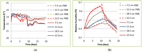 Comparison of temperature (T) (a) and relative humidity (RH) (b) of the numerical results obtained by the heat, air and moisture (HAM) model presented above and the experimental results [24].