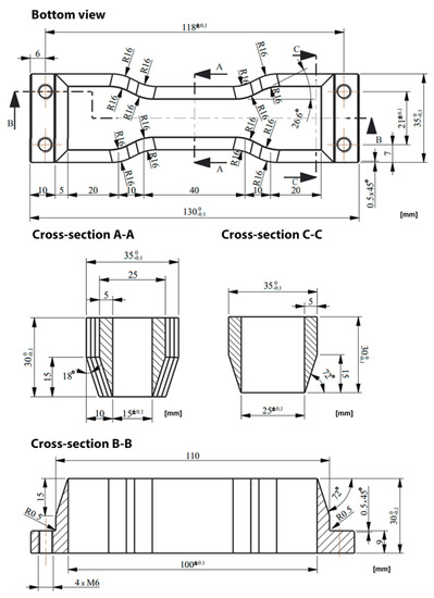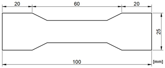 The sizes of the testes samples were the same and are presented in Figure 1. To ensure the same dimension of the samples, a special cutting knife was prepared—this tool is shown in Figure 2. Samples were cut from sheets at least 100 mm from each edge to limit the influence of the edge zones of the sheet. Around each specimen, there were left a 50 mm space to minimise any influence of the sample cutting process.