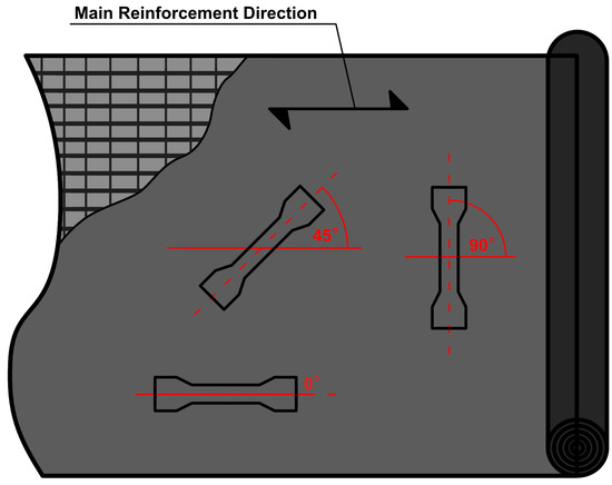The direction in which the specimens were cut from the sheet (solid red lines represent the main direction of reinforcement).