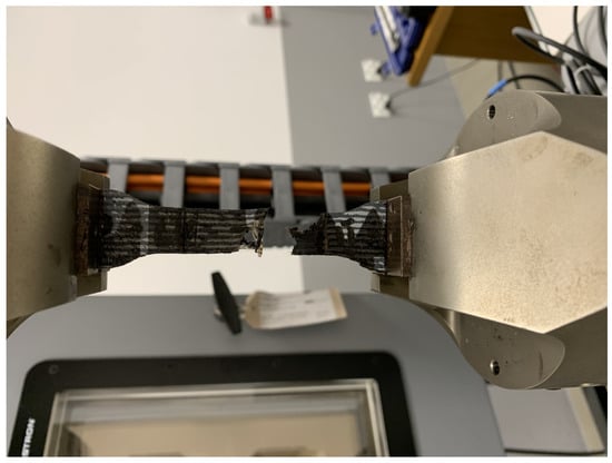 Distance between the upper and lower jaws of the testing machine was constant and equal to 70 mm, and this value is the reference length in the calculation. The strength test was carried out with a constant speed of deformation equal to 100 mm/min, until the sample breaks or there is a sudden drop in force value—Figure 4.