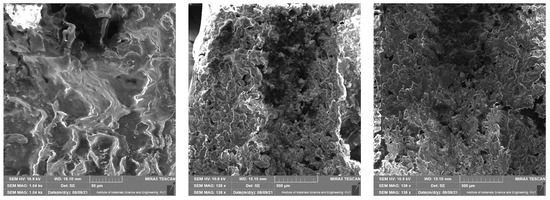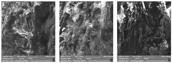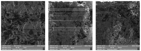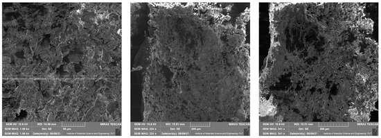 This section presents results taken with the scanning electron microscope Tescan Mira 3. They are divided into four groups depending on the material of the samples. Pictures were taken with a scanning electron microscope at different magnifications—10 µm, 50 µm, 200 µm, 500 µm (a scale of a photo is presented in each picture). The photos show the surface of the cross-section of the samples also taken at the highest possible magnification, which was limited by the type of material. These photos are unique because they present the structure of the material and because they were made without spraying with conductive coatings. In consequence, direct observation of the tested preparation was possible.