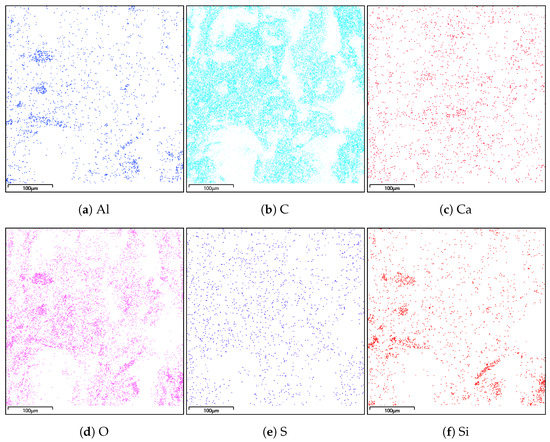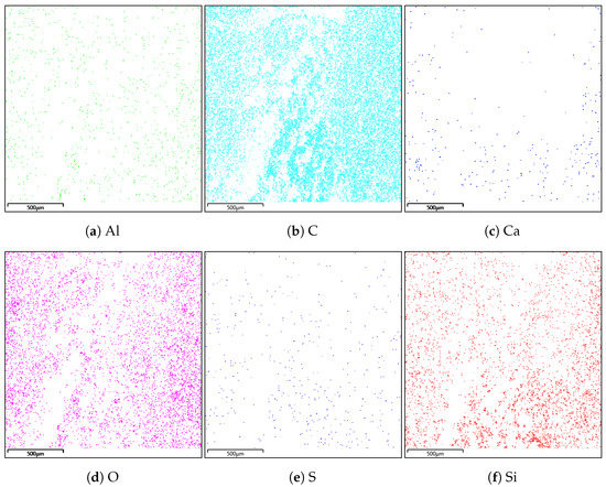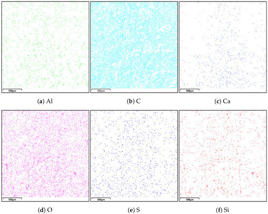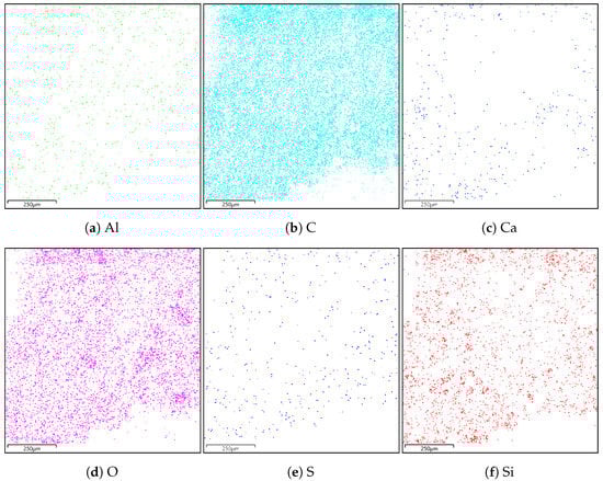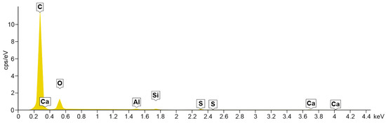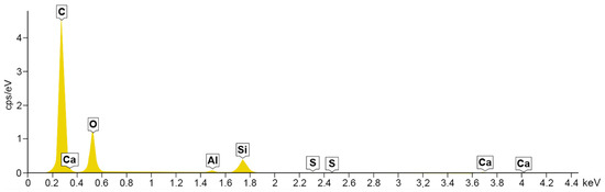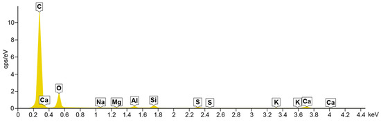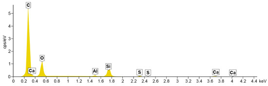 In all samples, carbon is the most abundant; its content varies around 70%. Oxygen is in second place with an amount of about 20%. Aluminium, silicon occurs in smaller quantities, as well as trace amounts of calcium, magnesium, sulfur and sodium were found. Secondly, in Figure 13, Figure 14, Figure 15 and Figure 16 the distribution of the detected by EDS chemical elements on the sample’s surface is shown. All materials, from M1 to M4, show a uniform distribution of elements in the entire volume of the samples—it was found on the basis of the analysis of the samples carried out on the cross-sectional area. The maps of the primary grid distribution for the M4 material show a relatively high degree of internality. This is equivalent to a large number of individual components on the analysed areas. Hence, the highest density of the M4 material should be expected. Due to the uniform distribution of the elements, no gradient changes in the mechanical properties of the samples are expected, which was proved in the part of this work describing the strength in the mechanical test. The tested roofing materials in the form of felts, also in the macroscopic approach, will show homogeneous mechanical properties.