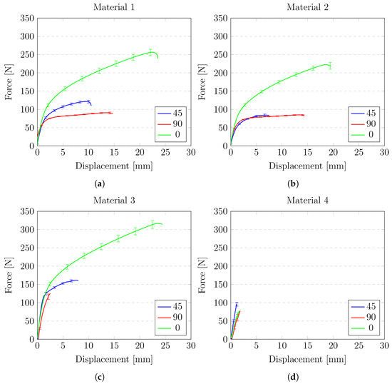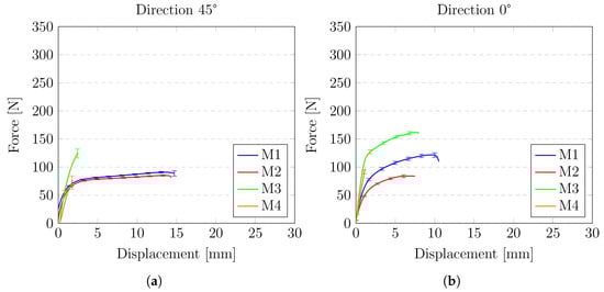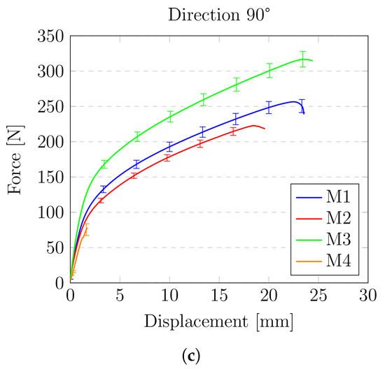 As it was mentioned above, the first three diagrams present the force-displacement curves for all four types of analysed roofing felt (M1, M2, M3, M4) depending on the cutouts of the sample in relation to the material fibres. Presented results were averaged—the spread of a data set is characterised by standard deviation. As it was expected, the highest strength for all of the materials was observed for the direction consistent with the direction of fibres—M1(0°), M2(0°), M3(0°), M4(0°). The most robust material (M3(0°)) reaches above 300 N of the force before it breaks up at the same time; this material was characterised by a relatively significant elongation of 25 mm which is about 35% of sample reference length 70 mm. On the opposite side material, M4(0°) shows the lowest strength and the smallest elongation of 2 mm, which is about 3% of reference length.