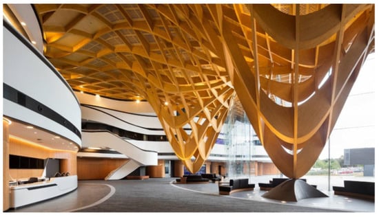 Furthermore, timber structures may satisfy architectural aspirations, and may ultimately result in reduced costs and higher construction speeds, compared to standard, more common forms of construction. To make the most of the benefits of timber, in addition to sawn timber, wood-based products, in the form of different versions of glue-laminated timber, have also been developed. They open up the possibility of various shapes and options for cross-sections depending on one’s needs, almost without restrictions. It is possible to use curved elements that significantly improve the aesthetic impression [4]. An example of one such aesthetically interesting building is given in Figure 2.