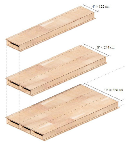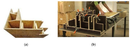 Fabric Workshop is a company that designs its system of hollow-core, solid wood panels (Figure 5), columns, and walls, for which 50% fewer wood fibers are used, and the total cost is 10–35% lower compared to CLT [9]. Due to the cavities and box shape, this system has a better strength/weight ratio than comparable steel and concrete systems. The elements are pre-manufactured, so there is no use of saws and hammers on the construction site. Rather, these large boards are assembled and connected with metal fasteners. Although the material is expensive, there are significant savings in execution speed and error prevention due to this design method.