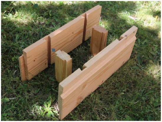 “BRIKAWOOD” [10] is a wooden brick building system, developed by the French company Catharhome, which allows you to quickly build a house without the use of nails, screws, or glue. Each unit consists of four parts: two side elements and two transverse spacers that fit into each other with the help of a classic dovetail joint (Figure 6).