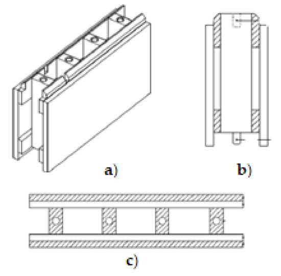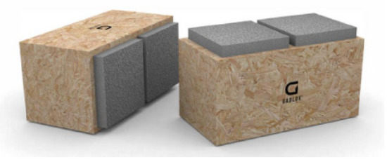 Another interesting system is “GABLOK” (Figure 7), which are insulated wooden blocks, designed in Belgium from recyclable materials [11]. Gablok has made the choice of using expanded polystyrene with a graphite additive (EPS) for its building system. The basic product has the form of styrene beads. Gabloks are available in three different lengths: 30 cm, 60 cm, and 90 cm. The height and width of individual blocks are always the same, 30 cm. An insulated wooden block of 60 cm weighs only 7.5 kg, which makes it very easy to handle, with no cranes needed on the construction site. The combination of wood and EPS provides significant insulation value, which can be further increased by the use of insulating materials on the outside of the blocks.