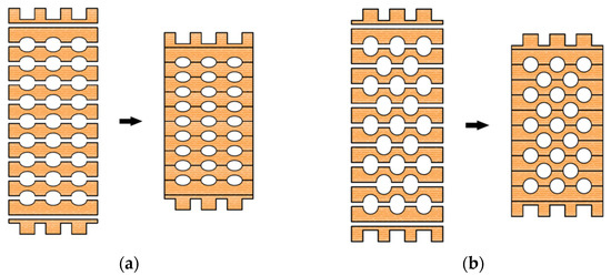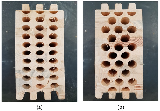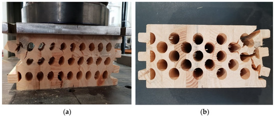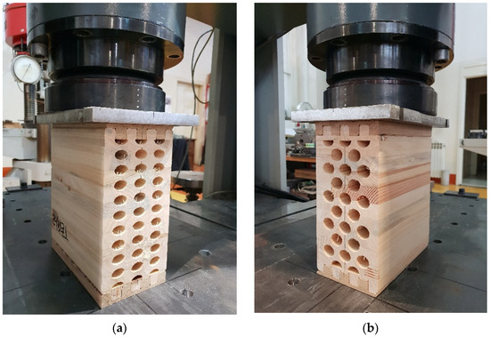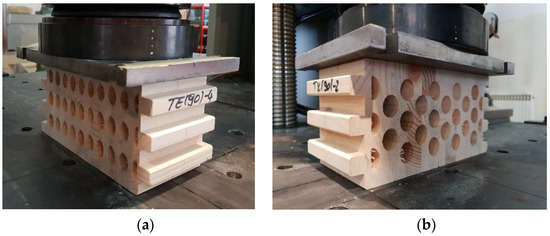 Timber samples during the experimental test of compression strength perpendicular to the grain in the direction of the stronger axis. (a) elliptical cavities; (b) circular cavities.