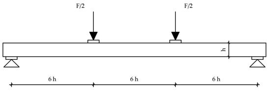 A dynamic–static universal machine from Zwick Roell GmBH test & Co. KG, Germany was used for the experimental bending tests. The load capacity of the machine is 250 kN, class 1, which means it has a 1% deviation. This system enables the collection of force magnitude, displacement, acceleration, relative deformation, temperature, and stress values. The system is suitable for short-term and long-term static high-resolution measurements. The data collection system is MGC plus from the manufacturer HBM—Hottinger Baldwin Messtechnik, Germany. The load was defined by displacement control, and the speed was 6 mm/min. The load was applied over a steel beam, with an additional I profile, simulating four-point bending. A total of six measuring channels were used as follows: time, deflection on the supports and in the midspan, piston displacement, and load. Linear variable differential transformers with a precision of 10 mm (supports) and 100 mm (midspan) nominal values were used for deflection measurements. Since there are notches in the end lamellae of the samples, additional timber elements were made and placed at the load input area. The substitute elements are made of hardwood and geometrically correspond to the shape of the specimen, taking the form of notched connections. The surface of the element, which is on the side of the load cell, is completely flat. In this way, proper load input was enabled. Given the aim of this study, it was necessary to set up a system to prevent lateral-torsional buckling of the element at the required positions. Slender bending beams that have a large h/w ratio and which are loaded parallel to the weaker axis tend to have stability issues. This is due to the deflection of the compression chord. The beam has a lateral displacement with simultaneous rotation. Consequently, steel clamps are placed on the supports, covering a minimum of two-thirds of the sample height. Regarding the experiment’s consistency, load-midspan displacement responded as expected, and all beams presented similar stiffness up to a certain load level corresponding to the elastic response. For higher loads, their stiffness was considerably reduced due to local defects of the timber, cracking, and the adhesive behaviour. Failure occurred due to the pressure reaching the tensile strength in the lower zone of the specimen. To determine the mechanical properties of the wood, the four-point bending tests on the timber elements were conducted according to EN 408 [26] (Figure 10). The samples were simply supported with a span of 18 h, where h represents the height of the sample. Both the distance of the force from the support and the distance between the forces is 6 h. In the areas of force input, small steel plates were placed to prevent local stress concentrations, i.e., to achieve better force distribution, spreading it more evenly per sample. Maximum force was reached after (300 ± 120) seconds. Displacements were measured in the middle of the span and on the supports.