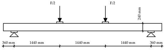 For the strong-axis bending, the samples were laid in such a way that the larger cross-sectional dimension equals the height according to EN 408 [26], which is 240 mm. This determined the distance between the two concentrated forces and the distance of the forces from the supports. The width of the beam is 120 mm. All other dimensions are shown in Figure 11, while the sample during the strong-axis bending test is shown in Figure 12.