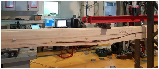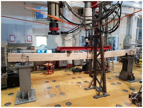 Timber beam during strong-axis bending experimental test.