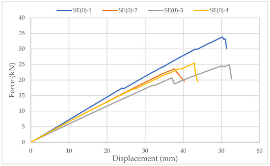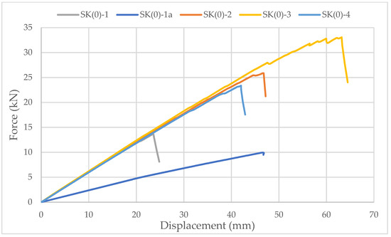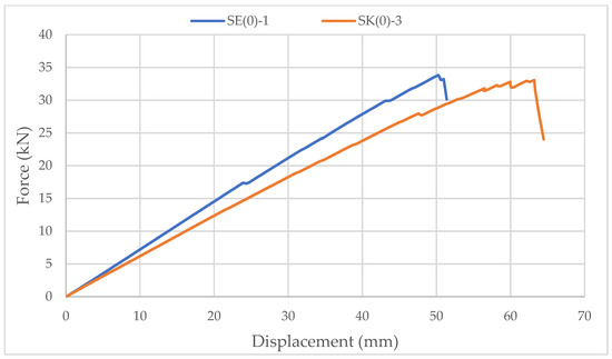 Specimens with ellipse-shaped cavities, marked SE(0)-n, and circular cavities, marked SK(0)-n, were tested. The notation (0) represents strong-axis bending, while “n” represents the number of the tested sample. In Figure 13, Figure 14 and Figure 15, the results, according to the data obtained from the tests, are shown.