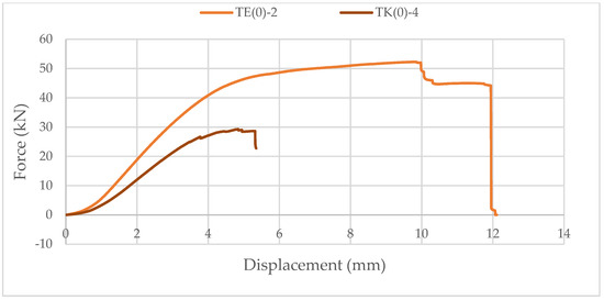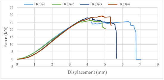 As it can be seen in Figure 18, as with the bending test, additional notched timber elements were made for this test to ensure the load input. The load speed was 1 mm/min, and the test lasted until the specimen failure occurred. The majority of the samples responded as expected, and the consistency can be seen in Figures 19 and 20, especially in the part of the branch with an elastic response, where all presented approximately constant stiffness up to the maximum load and similar displacements at failure.