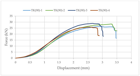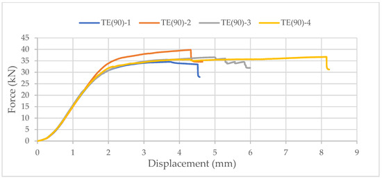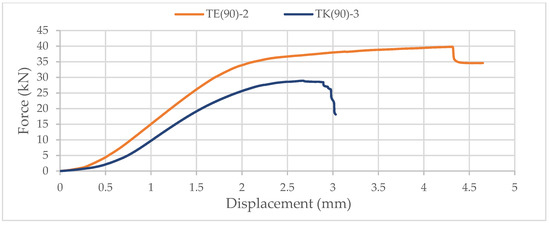 Again, samples with ellipse-shaped cavities, marked TE(90)-n, and circular cavities, marked TK(90)-n, were tested. The notation (90) represents compression in the direction of the stronger axis, while “n” represents the number of the tested sample. In Figure 24, Figure 25 and Figure 26, the results, according to the data obtained by tests, are shown.