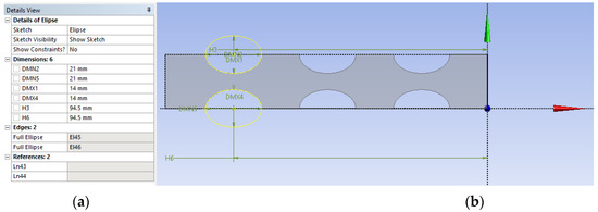 The geometry is parametrically defined (Figure 28a) in the second step, using Design Modeler (Ansys 2020 R2, Canonsburg, PA, USA). It can thus be changed at any time so that the optimal shape and arrangement of the cavities can be found (Figure 28b).
