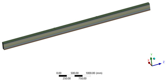 Khorsandnia, Valipour, and Crews [19] modeled the composite timber–concrete beam using the finite element method and subsequently performed a manual calculation according to Eurocode 5 [20] to compare the results. The wood was initially modeled so that the modulus of elasticity, displacement, and Poisson’s ratio had different values for the three main directions (longitudinal, tangential, and radial). It was subsequently concluded that the mechanical properties of wood, in the direction perpendicular to the grain, have little effect on the beam response globally, and the isotropic characteristics of the material for beams without knots and defects and with dominant bending provide an error of less than 5% compared to orthotropic beams. Most of the mechanical properties of timber are taken from the test results. The concrete and timber parts were modeled as two separate bodies, and in the places of mechanical joints, springs that prevented only vertical movement were modeled.