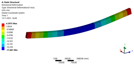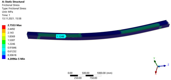 After a calculation during ˝Model Solution˝, results are shown. ˝Directional Deformation˝ can be seen in Figure 30. When ˝Normal Stress˝ is shown (Figure 31), areas of compression and tension can be observed. Compression areas are painted blue with a negative value, while red color and a positive value indicate tensile stress. In Figure 32, “Frictional (Shear) Stress” is shown.
