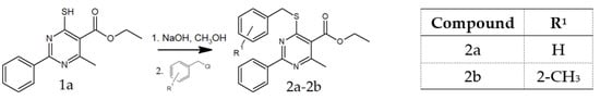 - Moustafa, A.H.; Assy, M.G.; Amr, E.A.; Saber, R.M. Studies on the chemical reactivity of ethyl 4-sulfanyl-6-methyl-2-phenylpyrimidine-5-carboxylate. Curr. Org. Chem. 2011, 15, 1661–1668. [Google Scholar] [CrossRef]